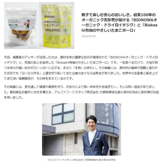 2025年に創業100周年を迎える弊社の歩みや、新ブランド「BIONOWA(ビオノワ)」に込めた想い、そして素材と製法にこだわり抜いた「オーガニック・ドライ白イチジク」や「有機のやさしいたまごボーロ」の誕生秘話について詳しくご紹介いただいています。