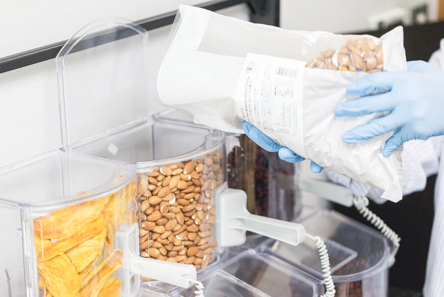 量り売り販売に適したドライフルーツ・ナッツ・チョコレート・豆類など、100種類以上の有機食品をラインアップしています。商品は国内の自社有機JAS認定工場で検品・袋詰めをし、什器への原料補充や店舗バックヤードでの在庫管理に適したサイズとなっています。